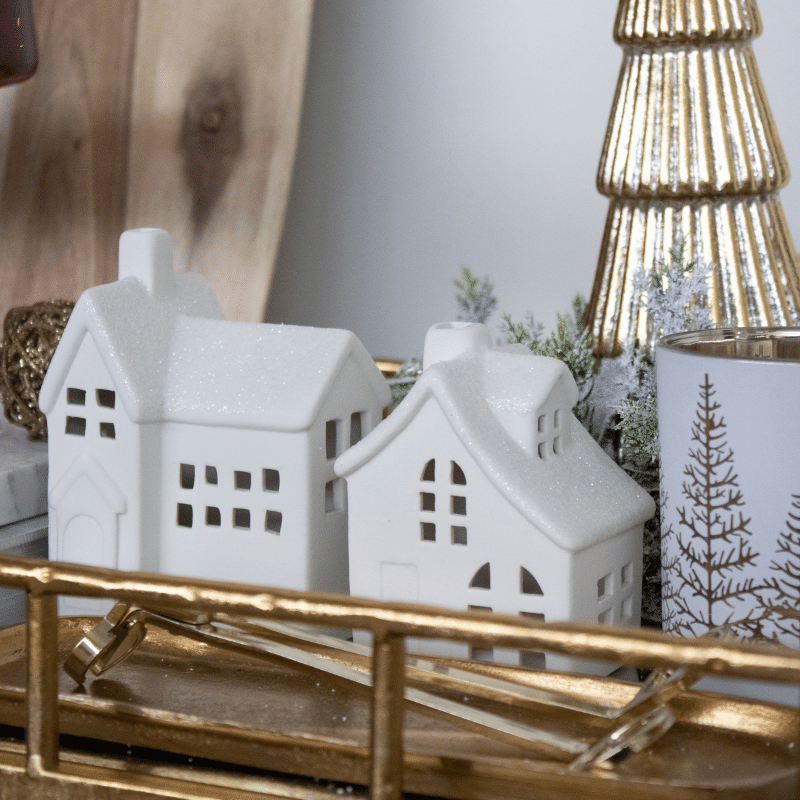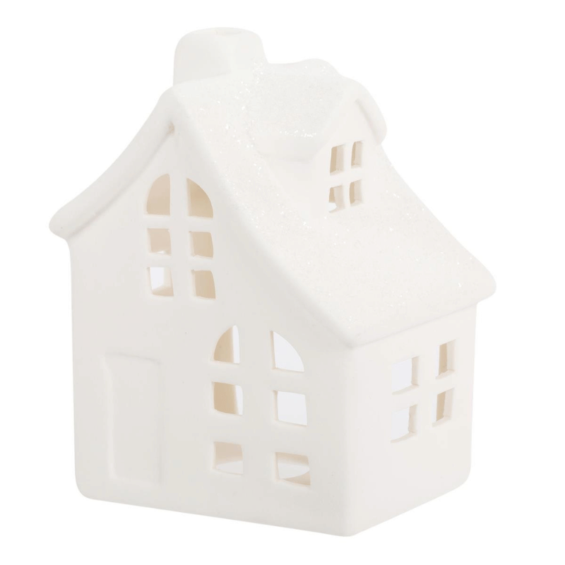 Add the romantic glow of candlelight to your home with our White Porcelain Tealight House. This adorable white ceramic house features a glitter roof. The included LED tealight illuminates the scene and creates a warm, cozy ambiance.