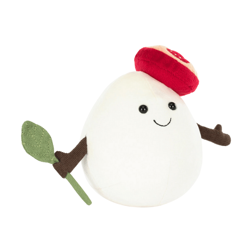 Jellycat's Amuseables Mozzarella is a cuddly Caprese cutie. A soft ball of cream fur, this fromage friend is adorned with a big smile and a chunky slice of textured tomato. With cocoa fine cord arms holding a suedette Basil leaf, this cheese sweetie is the perfect gift for foodie friends and cheese lovers alike!