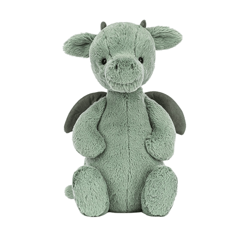Bashful Dragon is a fierce little friend, with plenty of attitude! With supersoft fur in pale sage green, suedey horns and a long, squidgy tail, this brilliant beastie is pretty fantastic. We love those neat little contrast wings, chunky feet and fine flappy ears - what a Jellycat legend! Hand wash only; do not tumble dry, dry clean or iron. Not recommended to clean in a washing machine. Suitable from birth.