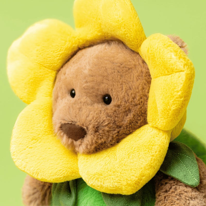 Jellycat's Bartholomew Bear Daffodil Outfit is blooming. Dressed head to toe in his sunny daffodil costume, he’s channeling pure flower power and sharing it generously with everyone he meets – by putting on a spring performance for his friends, naturally!